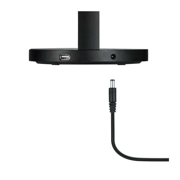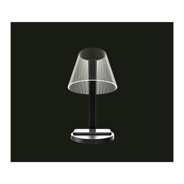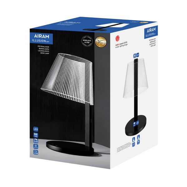 Airam Illusion Dot är en snygg och multifunktionell bordslampa med mångsidiga funktioner. Qi-kompatibla mobiltelefoner kan laddas trådlöst på lampans fot, samtidigt som en annan uppladdningsbar enhet kan laddas från lampans USB-port. Med lampans touch-funktion kan du med enkelhet justera färgtemperaturen i fem steg, från en atmosfärisk varm 2700 kelvin ton till ett starkt vitt 5200 kelvin ljus. Ljusflödet går även att justera från 10-100%. Lampan tänds och släcks genom att vifta med handen över rörelsesensorn eller genom att trycka på lampfoten. Tillverkaren anger ett ljusflöde på 430 lm, färgtemperatur 2700-5200 K.