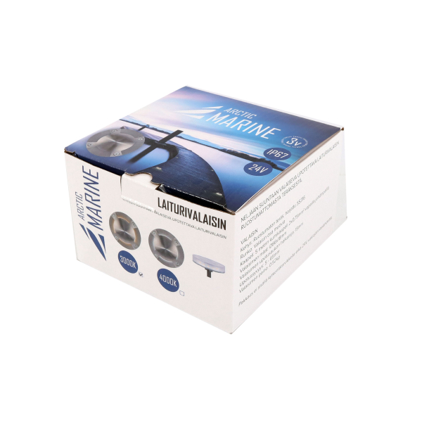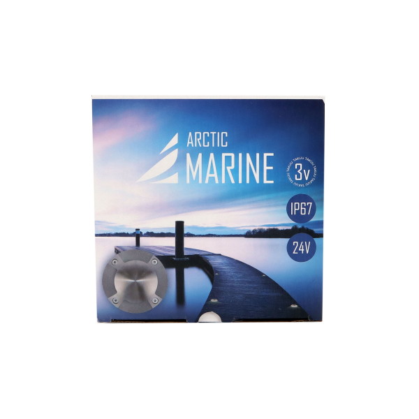 Arctic Marine är en infälld bryggbelysning som lyser i fyra riktningar. Förutom ljuset innehåller paketet en 5 meter gummikabel med fria kabeländar (2 x 0,75 mm²). Nedsänkningsöppning 15 mm, nedsänkningsdjup 5 - 65 mm. Färgtemperatur 3000 Kelvin. Deklarerat ljusflöde är 130 lumen.