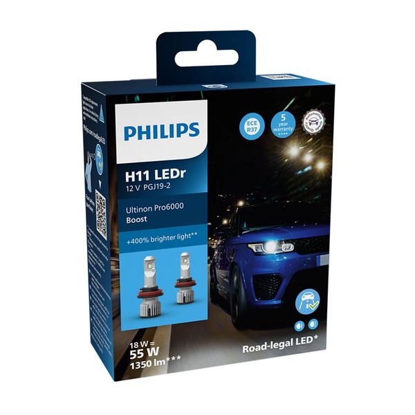 Philips Ultinon Pro6000 Boost ECE R37 är Philips första LED-konvertering som är helt godkänd för användning på allmän väg i Sverige. i flera EU-länder när de monteras i godkända fordonsmodeller. Notera att godkännandet inte gäller alla typer av fordon och fordonsmodeller. Lamporna är godkända enligt ECE R37, vilket betyder att alla 12V-fordon som användar H11 sockel kan konverteras till modern LED-teknik utan behovet att matcha godkännande nummer eller officiella godkännandedokument. Genom att uppgradera till modern LED-teknik får du ett klart, vitt sken på upp till 1350 lumen per lampa med en neutral färgtemperatur på 5800 K som liknar dagsljus — och upp till 400 % mer ljus jämfört med de lagstadgade minimikraven för halogenlampor. LED-konverteringen lämpar sig för halvljus och främre dimljusinstallationer och den kompakta storleken som är 30 % mindre än sin föregångare gör den lätt att montera i de flesta fordon.