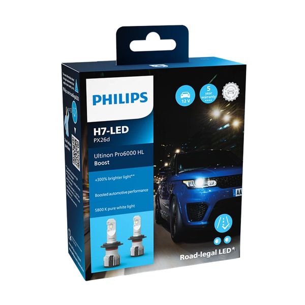 Tack vare LED-chipens perfekta läge riktas ljuset exakt mot önskad punkt på vägen och tillsammans med Philips SafeBeam-teknik skapas ett optimal ljusbild som inte bländar mötande fordon. Dessutom är Philips Ultinon Pro6000 mycket långvariga tack vare AirBoost-värmeregleringssystem, vilket ger en livslängd på upp till 3 000 timmar. LED-konverteringen är avsedd för 12 V-system och levereras i par. I många bilar är det plug-and-play. Vissa modeller kan kräva tillbehör som CANbus-adapter, hållare eller nya dammskydd. Två års (24 månader) garanti.