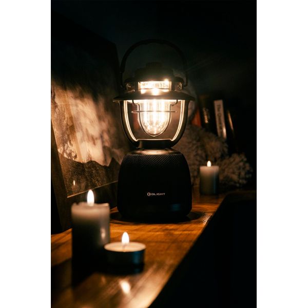 Olight Olantern Music är en helt ny typ av led-lykta som kombinerar musik och stämningsbelysning på ett roligt sätt! Från utsidan ser Olantern Music ut som en ganska traditionell lykta, men dess nedre del fungerar som en högtalare med utmärkt ljudåtergivning, och gör att du kan lyssna på dina favoritlåtar eller ljudböcker i tältet efter en lång dags vandring, under en middag på altanen eller medan du slappar i sommarstugans hängmatta. Lyktan erbjuder både en kallvit och en varmvit färgtemperatur, som kan dimmas steglöst från ett maximalt ljusflöde på 300 lumen till en mild stämningsbelysning på 10 lumen. Ytterligare en funktion är att ljuset kan ställas in till att "dansa" med musiken, och med denna funktion pulserar lyktans ljus i takt med musiken. Den retroliknande designen på lyktan tillför en touch av charm, och är också en snygg inredningsdetalj på innergården, sommarstugan, på balkongen eller inomhus i exempelvis ett barnrum.