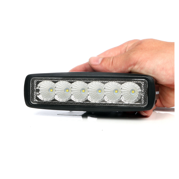 18W LED-arbetslampa med låg profil. Bred ljusbild vilket ger mycket ljus på nära håll. Neutral 6000K-färgtemperatur. Klarar både 12V- och 24V-elsystem. 24 månaders garanti!