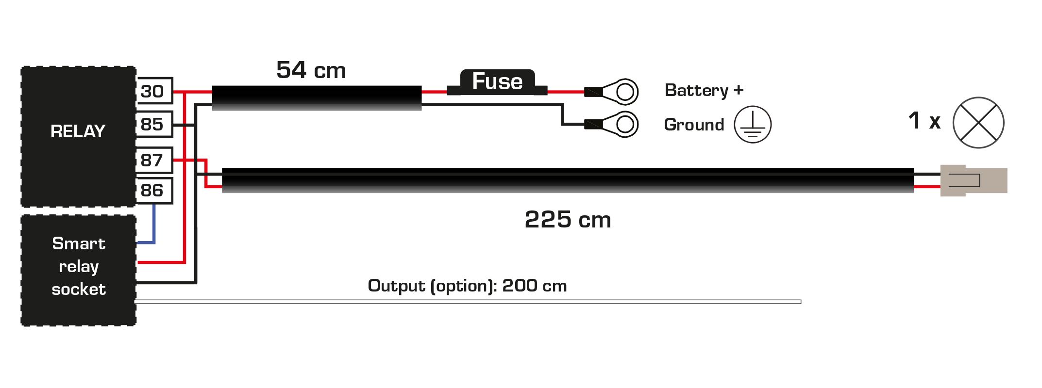 Reläkabelsatsen finns i som alternativ med en eller två utgångar för installation av 1-2 extraljus. Utöver DTP-2-kontakterna finns det en separat ledning avsett för anslutning av eventuella positionsljus på extraljuset. Reläkabelsatsen är lämpligt för 12V-system. Maxkapaciteten för 1-utgång är 280W och 2-utgångar är 480W (240W / kontakt).