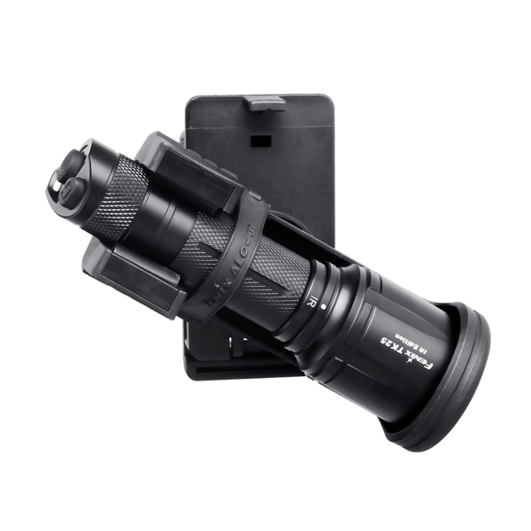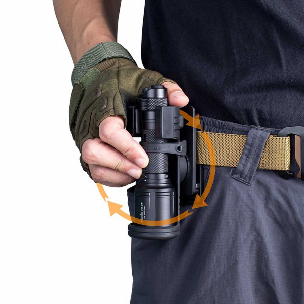 Fenix ALC-01 är ett taktiskt, snabböppnande hölster som är lämpligt för lampor med en ljushuvuddiameter mellan 30 och 44 mm och en kroppsdiameter mellan 20 och 26 mm. Tack vare snabbfästet kan lampan användas snabbt när situationen kräver det. Den robusta nylon/glasfiberkompositkonstruktionen säkerställer hållbarhet även under tuffa förhållanden. Detta fodral är perfekt för säkerhetsarbete, patrullering och annan taktisk användning. Hölstret är vridbart 300°. Förutom det taktiska bälteshölstret innehåller paketet ett fästspänne.