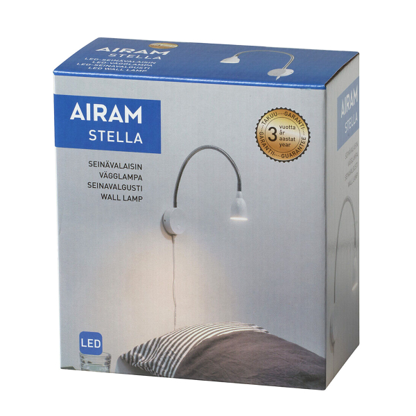 Airam Stella är en snygg och praktisk vägglampa som passar utmärkt att använda som exempelvis läslampa i sovrummet, eller i andra rum där riktat ljus är att lämpligt. Med ett ljusflöde på 170 lumen (enligt tillverkaren) och en färgtemperatur på 3000 K, ger den ett behagligt ljus för läsning. Den flexibla metallarmen gör det enkelt att rikta ljuset fritt i önskad riktning och strömbrytaren är bekvämt placerad på väggstativet. Tillverkad i metall och plast, färgtemperatur 3000K.