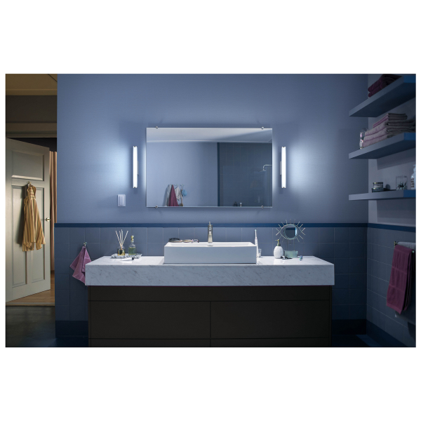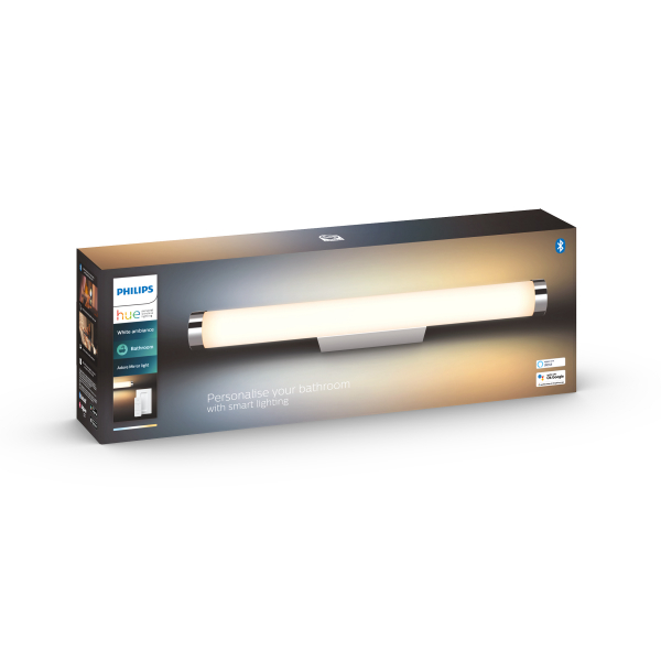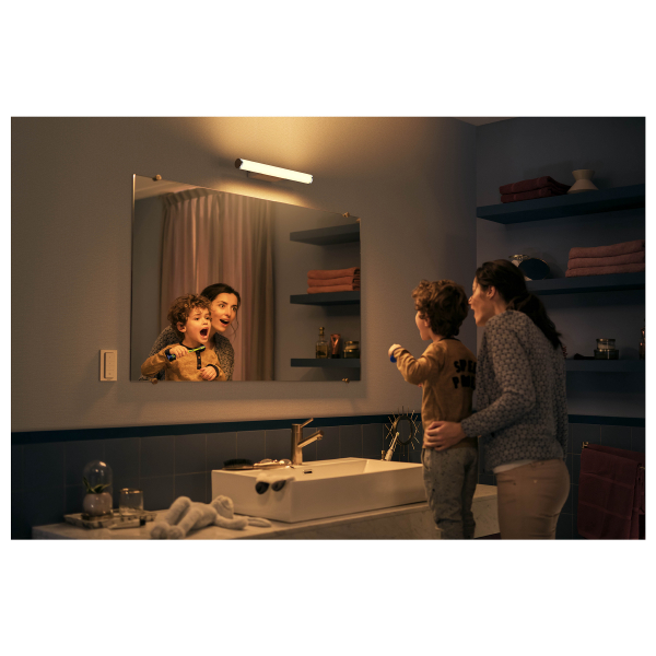 Philips Hue Adore är en snygg vägglampa lämplig för fuktiga utrymmen, till exempel ovanför eller på sidorna av en badrums- eller toalettspegel. Den justerbara färgtemperaturen på 2200 - 6500 K kan justeras steglöst via Hue-appen eller direkt med den medföljande Hue Dimmer Switch, eller så kan den kopplas till Hue Bridge, i vilket fall lampan kan styras med andra Hue-lampor via Bridge. Philips Hue-lampor fungerar sömlöst med alla Philips Hue smarta tillbehör som, och kan givetvis även tändas och släckas med en vanlig strömbrytare. Lampan kommer ihåg den senaste ljusinställningen den hade. Adore finns i två olika storlekar och effekt. Deklarerat ljusflöde 1520 lm, färgtemperatur 2200 - 6500 kelvin. Två års garanti!