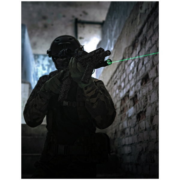 En kompakt vapenlampa som ger vitt ljus och grönt laserljus för professionellt bruk eller den krävande entusiasten. Smal spotlight, angivet ljusflöde 1000 lm, räckvidd 180 meter. Passar Picatinny-skenor, Kapslingsklass IPX4.